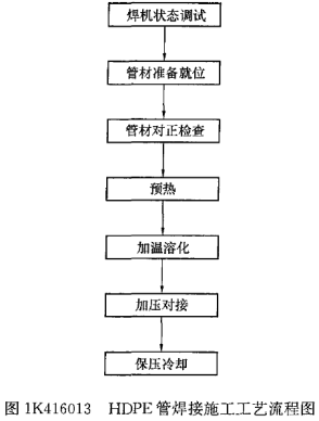 HDPE渗沥液收集花管连接一般采用热熔焊接。热熔焊接连接一般分为五个阶段:预热阶段、吸热阶段、加热板取出阶段、对接阶段、冷却阶段,施工工艺流程参见图1K416013。